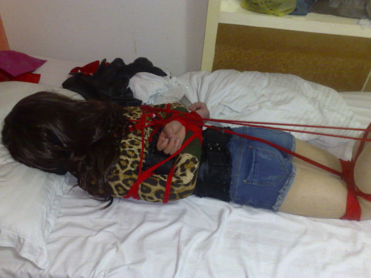 以此类推,捆到脚腕和脚掌,捆脚掌时一定要把绳子捆到高跟鞋根的地方和脚腕相连,这样在挣扎时高跟鞋就不会掉了。到这时,我已经受不了了。这还没完呢!她说,怕我自己解开,又让我把拳头握紧,用胶带把每个手缠紧,再把两只手缠在一起,说这才放心,大家说,还用这样吗?